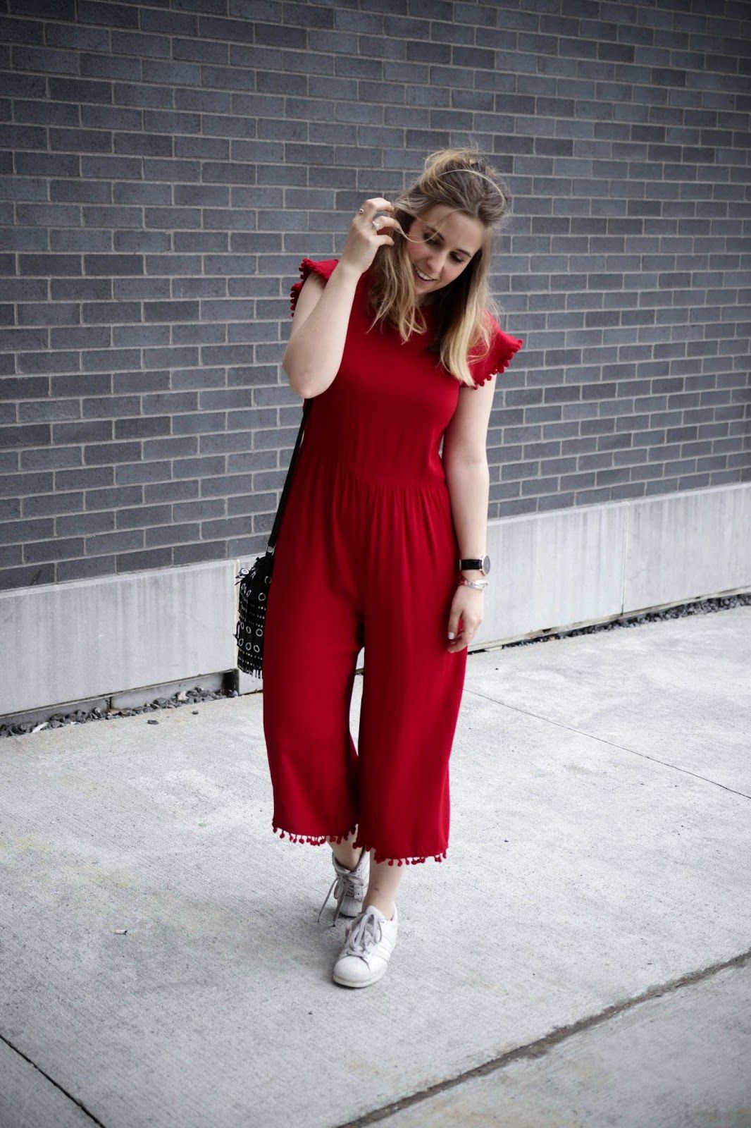 Look très simple car il est composé d'une combinaison rouge Zara mi-longue et d'une paire de basket blanches.